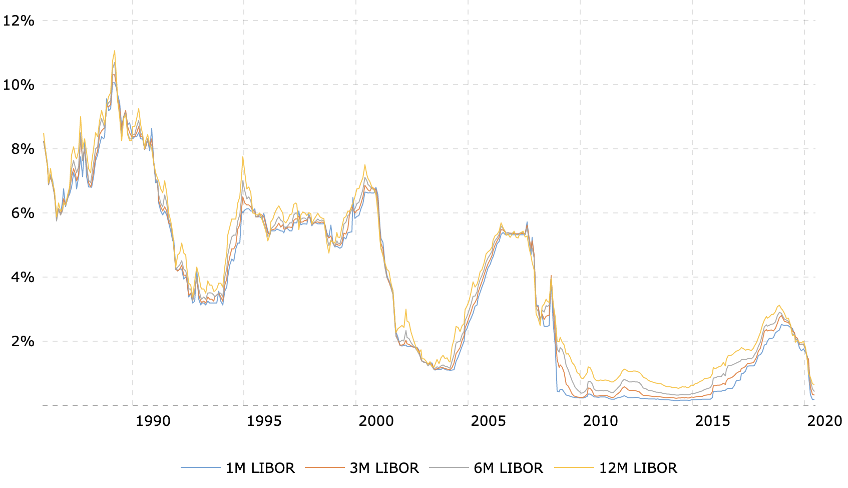 Another example is the continuous demise of the interest rate. A look at the 30-year LIBOR rate shows that the trend has been downward since 1988.