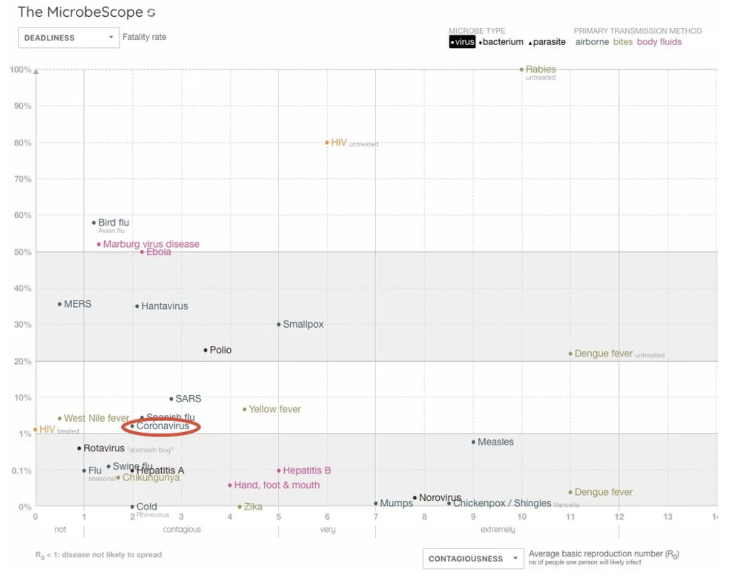 After a few months of the virus being out there, it can be mapped on a deadly vs contagious quadrant, alongside other viruses that mother nature has presented us with. When I first saw a similar version of this quadrant a few weeks ago, I though WTF... is that all it is?