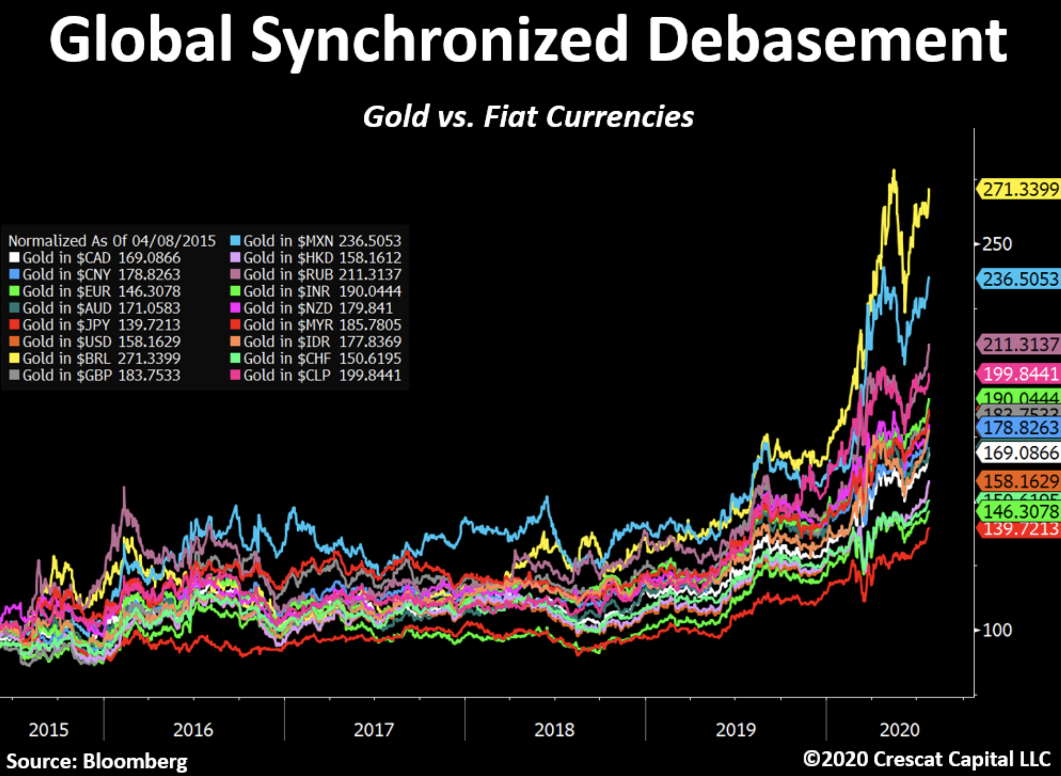 It is more important to understand the big forces at play, the multi year trends, than the daily news and their constant contradictions. In the world of money, and the world of King of Money USD, we are still in this race to the bottom as to who is going to debase its currency faster than its neighbour, to gain a short term advantage in exporting their stuff and therefore sustaining their economy for one more day. This race to the bottom is called currency debasement, and all of them are racing each other, as you can see...